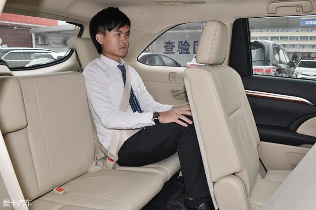 在第二排座椅保持最前时,体验者进入后排,此时第三排空间头部有两指的距离,腿部可以有一拳的距离,空间较为宽裕,可以用来短途应急。
