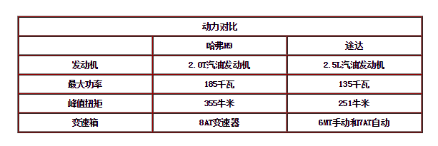 单从数据对比中我们发现,在动力方面,哈弗H9的动力比途达强劲不少。而在变速器方面,哈弗H9的变速器比途达变速器先进,且换挡更加平顺,不过途达7AT也算够用。