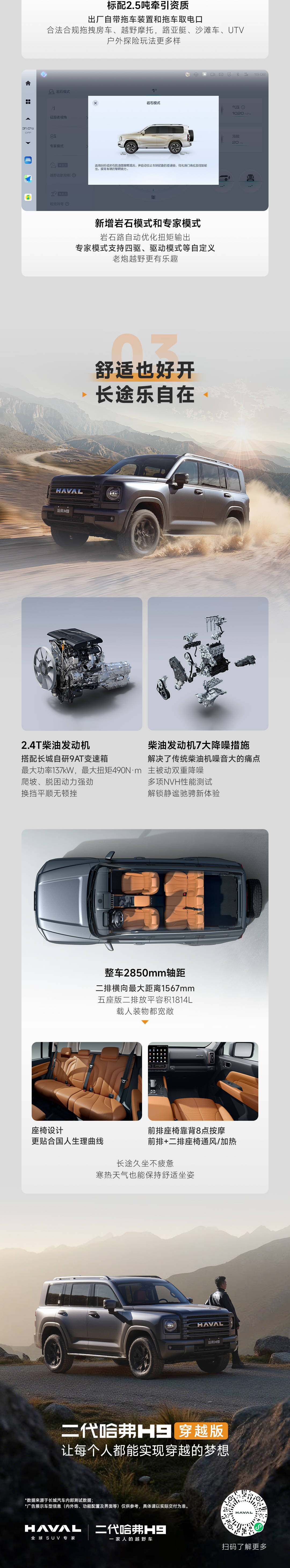 在长途出行体验上,新车注重舒适性与智能化平衡。车内配备大空间座椅、多层静音技术及L2级辅助驾驶功能,兼顾越野场景的耐用性与公路驾驶的轻松感。此外,哈弗为首任车主提供发动机、变速箱终身质保,并推出5年/15万公里整车超长质保政策,进一步强化“可靠越野”标签。